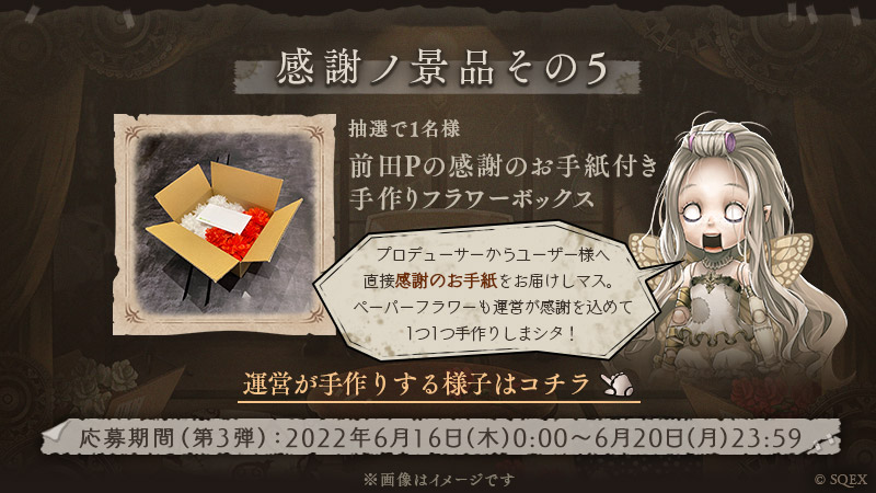 ※運営の手作り品とは、「手作りリアル魔晶石(石)」、「ダンボール製シノアリスオリジナルギター」、「前田Pの感謝のお手紙付き手作りフラワーボックス」を指します